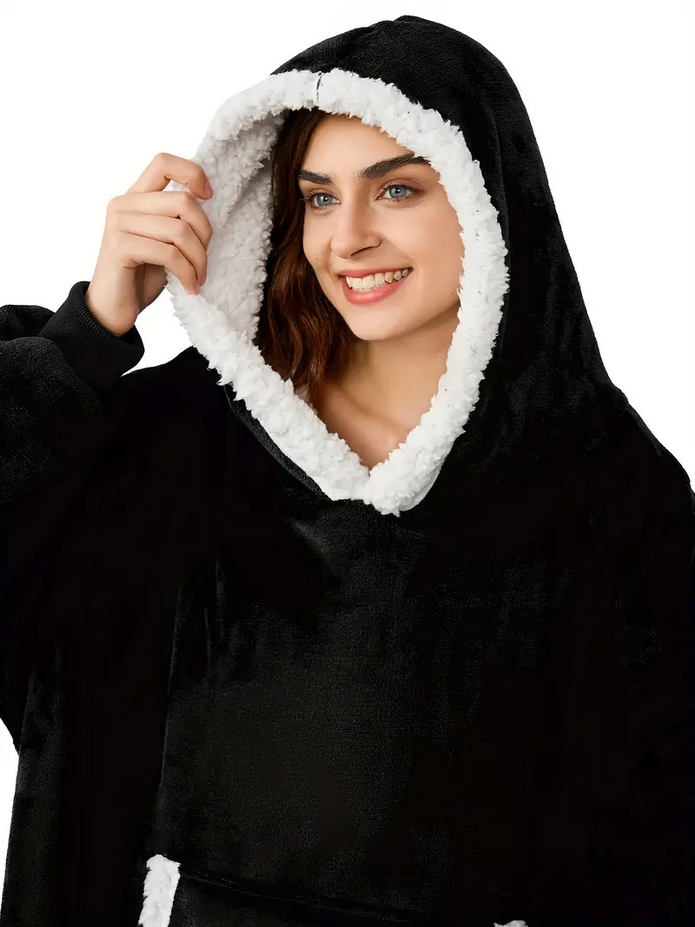 The hoodie provides enhanced comfort and superior heat retention, ensuring your head stays warm even in the coldest conditions. In addition, the generously sized front pocket offers convenient storage for your essentials, keeping them easily accessible at all times. Designed for versatility, this blanket hoodie is reversible, allowing you to switch between styles or textures according to your preference.